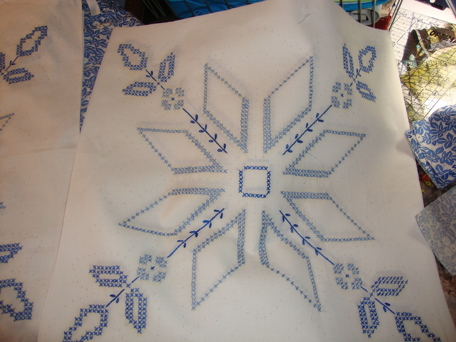 These embroidered squares belong to my "yo-yo" friend from church, Leanna. They needed to be squared up, but since they were printed on the fabric, it was a challenge...I did my best. Finally, "Pokey" went to work to get them sewn into a quilt top!